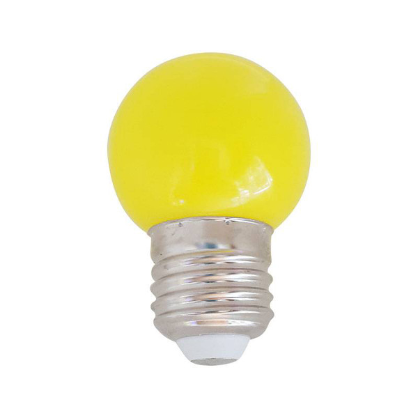 Bombilla LED esférica. Tamaño muy compacto. Esfera de plástico anti-rotura de color amarillo con el mismo aspecto que las clásicas bombillas de colores.