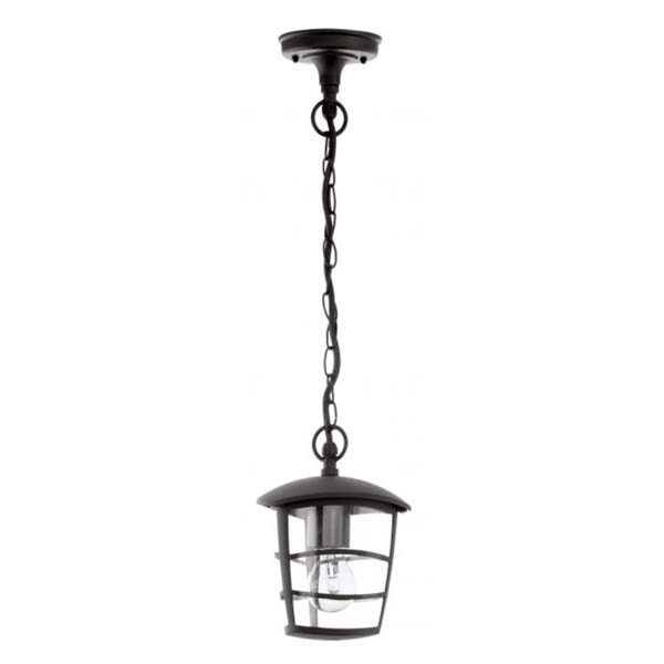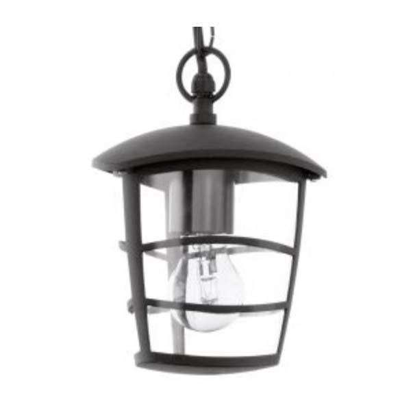 Lámpara colgante, apta para exterior, fabricada en fundición de aluminio color negro. Farol de aspecto moderno colgado de cadena.