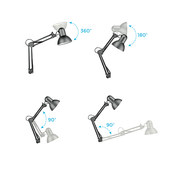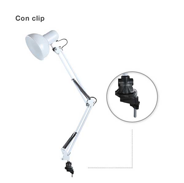 Lámpara flexo articulado para fijar en mesas o estantes de librería. El clásico flexo conocido como lámpara de arquitecto. Tanto la pantalla como el brazo son regulables y permiten dirigir la luz de forma eficiente. Ideales para estudios, talleres, estantes y librerías. Fabricada en metal de color blanco. Incluye cable de conexión con interruptor. Se fija a la mesa mediante su soporte de pinza (disponemos de recambio). Para bombillas de casquillo estándar (E-27). Recomendamos el uso de bombillas LED.
