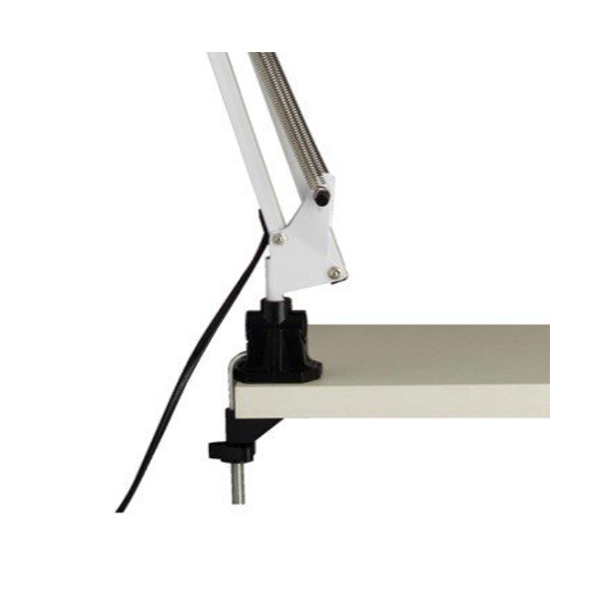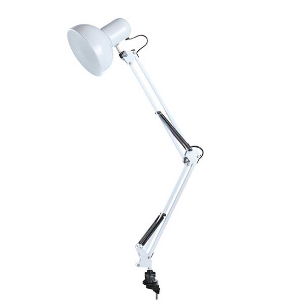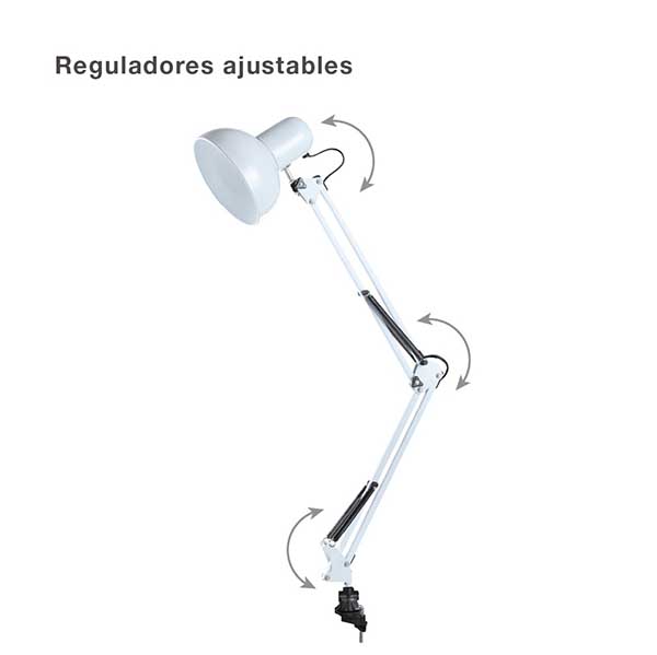 Lámpara flexo articulado para fijar en mesas o estantes de librería. El clásico flexo conocido como lámpara de arquitecto. Tanto la pantalla como el brazo son regulables y permiten dirigir la luz de forma eficiente. Ideales para estudios, talleres, estantes y librerías. Fabricada en metal de color blanco. Incluye cable de conexión con interruptor. Se fija a la mesa mediante su soporte de pinza (disponemos de recambio). Para bombillas de casquillo estándar (E-27). Recomendamos el uso de bombillas LED.