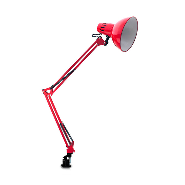 Lámpara flexo articulado para fijar en mesas o estantes de librería. El clásico flexo conocido como lámpara de arquitecto. Tanto la pantalla como el brazo son regulables y permiten dirigir la luz de forma eficiente. Ideales para estudios, talleres, estantes y librerías. Fabricada en metal de color rojo. Incluye cable de conexión con interruptor.