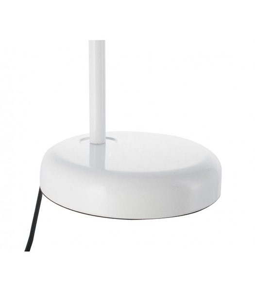 Bonito flexo metálico, de color blanco, de formas redondeadas. Lámpara de sobremesa idónea para escritorios. En la parte superior dispone de un flexo que permite orientar la luz. Cable de conexión con enchufe e interruptor.