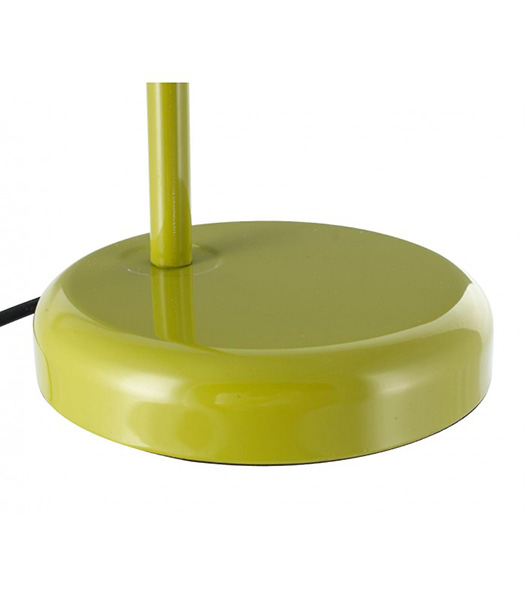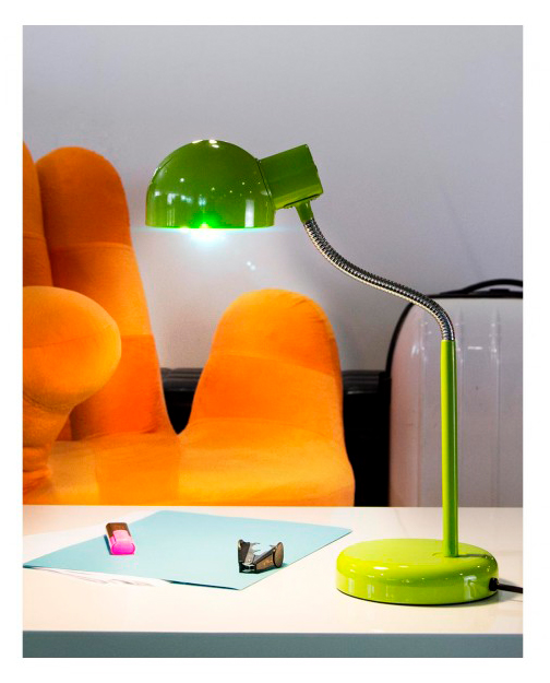 Lámpara de sobremesa fabricada en metal de color verde. De bonitas formas redondeadas. Dispone de un flexo que permite orientar la luz hacia cualquier dirección. Ideal para escritorios y estudios. Cable de conexión con interruptor.