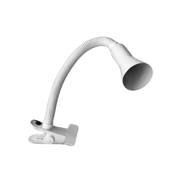 Lámpara flexo con una pinza en su base para fijar a estantes, mesas o muebles. Su largo y flexible brazo permite dirigir la luz al lugar deseado. Fabricada en metal de color blanco. Para bombillas de rosca fina E-14. Recomendamos el uso de bombillas LED.