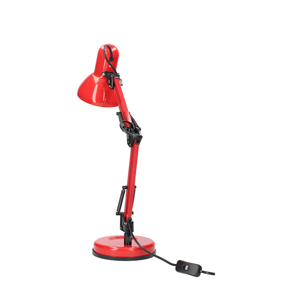 Lámpara de sobremesa tipo flexo articulado. Metálico de color rojo. Con interruptor en el cable de conexión.