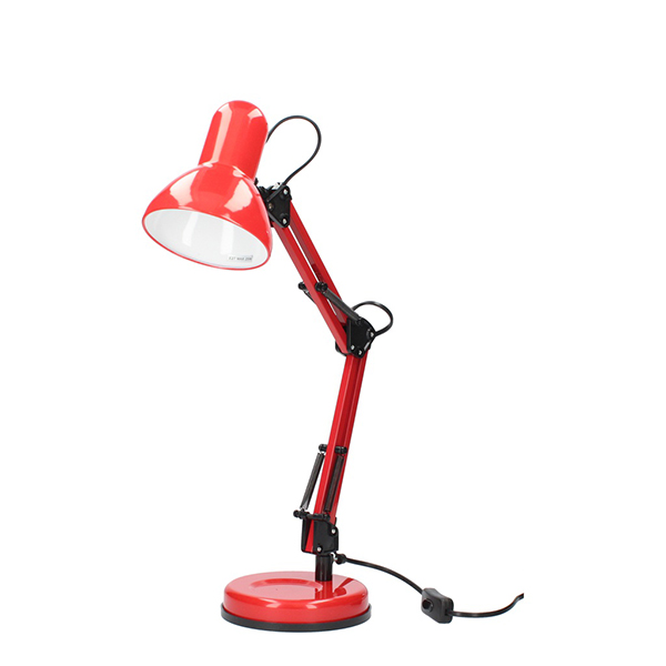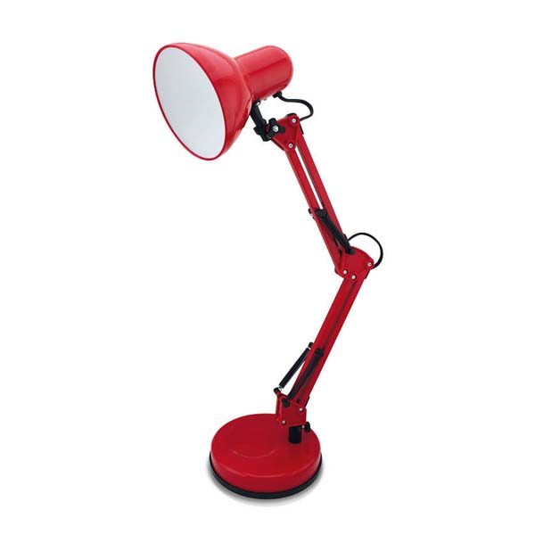Lámpara de sobremesa tipo flexo articulado. Metálico de color rojo. Con interruptor en el cable de conexión.