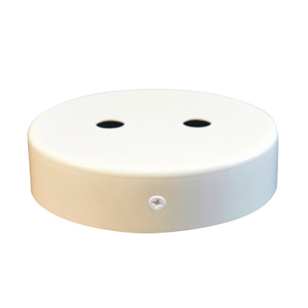 Florón de hierro esmaltado con pintura de color blanco roto. Pieza para colocar en el techo y cubrir la conexión de la lámpara. Con dos orificios para dos salidas de cable. Incluye kit para montar (travesera y tornillería).