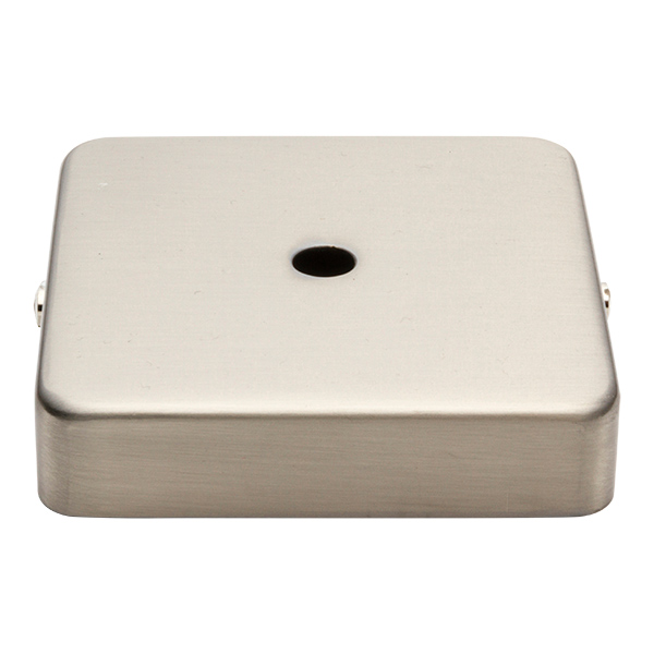 Florón metálico plano en acabado acero natural. Su forma cuadrada lo hace un tanto especial, diferenciándose del clásico florón redondo. Pieza para colocar en el techo y cubrir la conexión de la lámpara. Incluye kit para montar.