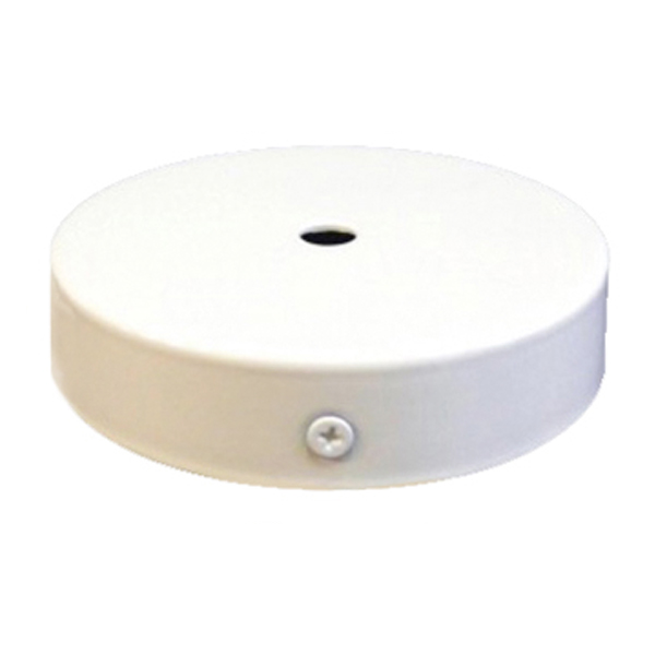Soporte de metal en color blanco que sirve tanto de florón de lámparas para techo o salida de cables y base para lámparas de pared. Incluye kit para montar (travesera metálica para fijar a pared o techo y tornillería)