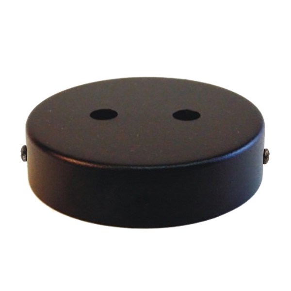 Florón de hierro esmaltado con pintura de color negro texturado. Pieza para colocar en el techo y cubrir la conexión de la lámpara. Con dos orificios para dos salidas de cable. Incluye kit para montar (travesera y tornillería).