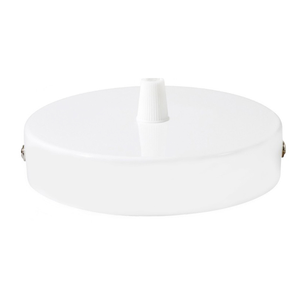 Florón metálico plano de color blanco. Pieza para colocar en el techo y cubrir la conexión de la lámpara. Incluye kit para montar y prensacables para sujeción de cable.