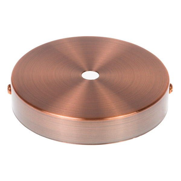 Florón metálico plano en acabado cobre. Edición vintage. Pieza para colocar en el techo y cubrir la conexión de la lámpara. Incluye kit para montar. Dimensiones: diámetro=99mm. Altura=24mm. Orificio para el cable=10mm.