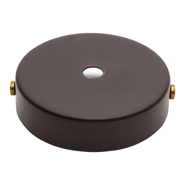 Soporte de metal en color marrón, texturado (con un ligero relieve) Utilizado como florón de techo para lámparas y como salida de cables y base para lámparas de pared (brazos, apliques,etc). Incluye kit para montar (travesera metálica para fijar a pared o techo y tornillería)