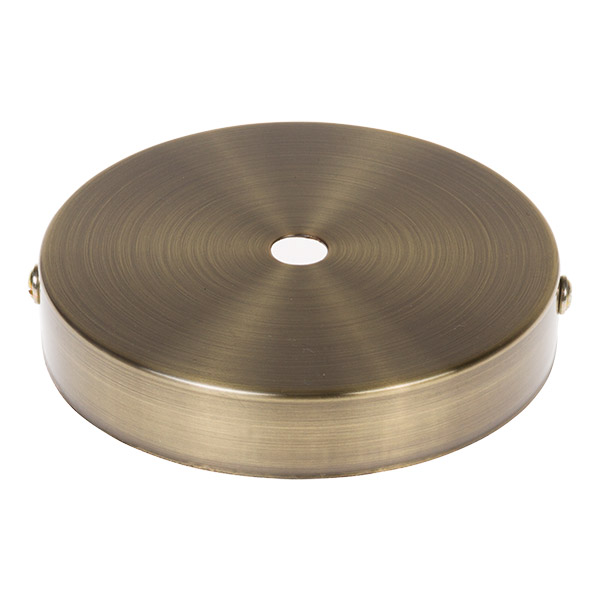 Florón metálico plano en acabado Oro Viejo. Edición vintage. Pieza para colocar en el techo y cubrir la conexión de la lámpara. Dimensiones: diámetro=99mm. Altura=24mm. Orificio para el cable=10mm.
