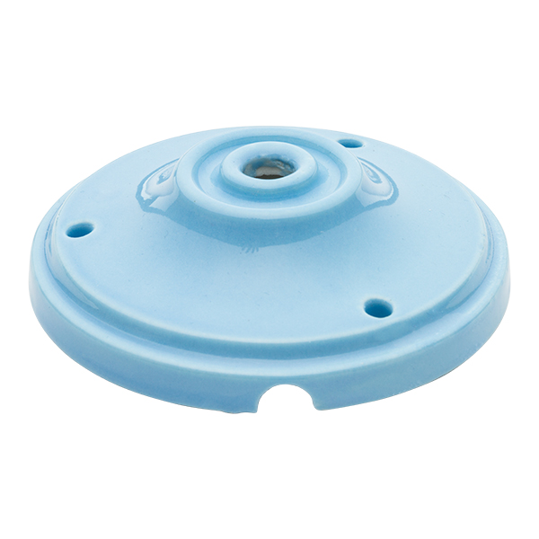 Florón de techo con salida de cables para la instalación de lámparas. Fabricado en porcelana esmaltada de color azul claro. Combínala con nuestros portalámparas de porcelana y crea tus propias lámparas o apliques.
