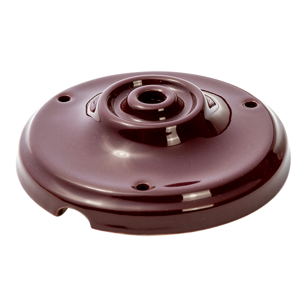 Florón de techo fabricado en porcelana de color marrón. Se utiliza para cubrir la conexión eléctrica de las lámparas que cuelgan del techo o también como salida de cables en la pared. Combínalo con uno de nuestros casquillos de porcelana y cables textiles. Dispone de un orificio central para el cable de 10mm y dos salidas laterales para entradas de cable.