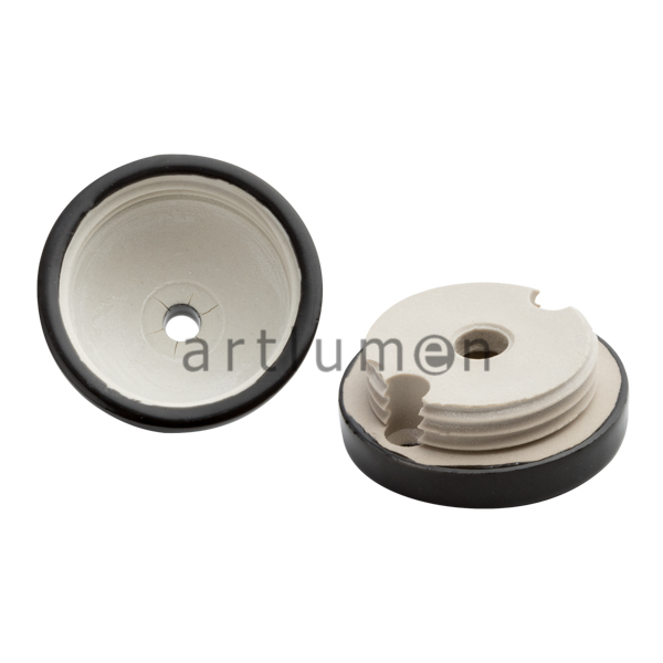 Florón de techo con forma de copa, fabricado en porcelana de color negra. Embellecedor para la salida del cable en lámparas de techo. Sirve también de caja de conexiones y salida de cables.