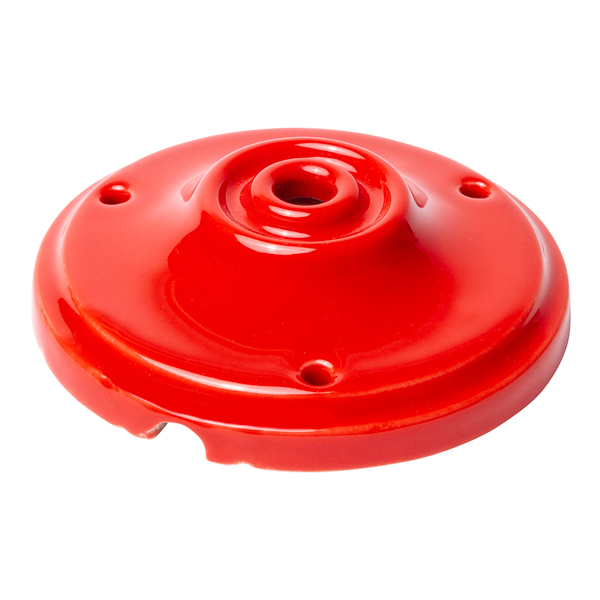 Florón de techo con salida de cables para la instalación de lámparas. Fabricado en porcelana esmaltada de color rojo. Combínala con nuestros portalámparas de porcelana y crea tus propias lámparas o apliques.