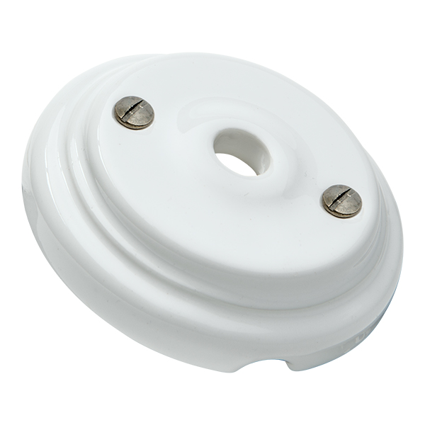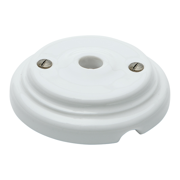 Roseta de porcelana de delicado acabado, de líneas limpias y modernas. Fabricada en porcelana de color blanca. Su reducido tamaño permite aplicarla para diferentes usos, lámparas de techo, salida de cables en pared o techo, distribución de cableado visto, etc.