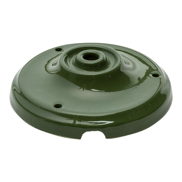 Florón decorativo, embellecedor de techo para cubrir la conexión eléctrica de la lámpara colgante. De porcelana en color verde. Disponemos de una amplia gama de casquillos de porcelana y cables textiles para poder combinar con este bonito florón tipo roseta.