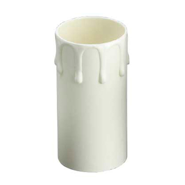 Funda de plástico simulando una vela de cera con gotas derramadas en color blanco. Pieza para cubrir casquillos lisos de rosca estándar (E-27) con un diámetro máximo de 40mm.