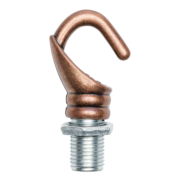Gancho de formas redondeadas fabricado en metal acabado cobre viejo. Complemento decorativo para roscarlo al portalámparas o lámpara y poder colgar en el techo.