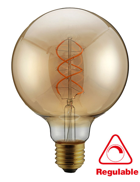 Globo LED decorativo de gran tamaño (diámetro=125mm) de cristal ámbar. Su LED en forma de filamento en doble espiral y su luz muy cálida (2200ºk) lo convierten en un atractivo elemento decorativo de aspecto vintage. Consume solo 5W e ilumina 300 Lumens. Ideal para lámparas y colgantes donde la bombilla queda vista.