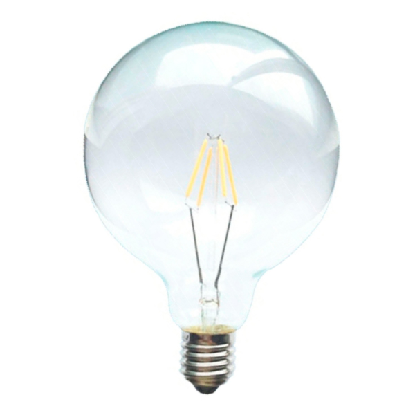 Globo decorativo con cristal transparente de 125mm de diámetro. Bombilla de filamentos LED de 4W de consumo y una equivalencia de unos 40W (400 Lumens). De luz cálida (2800ºk). Ideal para decoración