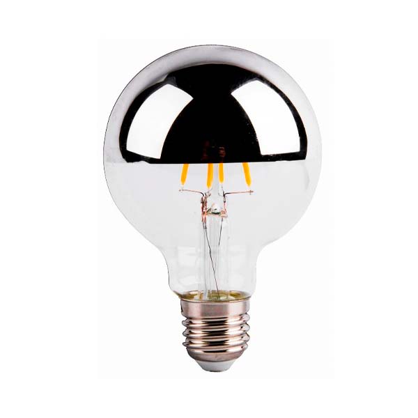 Bonita Bombilla decorativa en forma de globo de 95mm de diámetro. Con filamentos LED de luz muy cálida (3000ºk) para simular la calidez de las bombillas incandescentes. Parte superior de la bombilla en aluminio efecto espejo de color plata. No deslumbra, dado que la luz sale por la parte inferior y los lados. Ideal para decorar, crear puntos de luz ambiente, escaparates de comercio, etc.