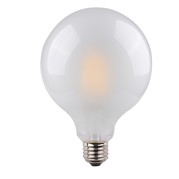 Globo LED, de 125mm de diámetro, con el cristal mate, simulando a la perfección el clásico globo incandescente mate. No tiene ninguna base de plástico que afee su acabado. Ideal para decoración o lámparas donde la bombilla quede al descubierto. En su interior dispone de unos micro filamentos LED, de 8W de consumo (1055 Lumens), de luz cálida (3200ºk). De rosca estándar E-27