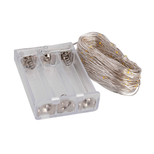 Guirnalda de finísimos LED’s (conocidos como “granos de arroz”) de tono cálido, montados a lo largo de una tira de alambre plateado de 10m.  Elegante adorno para navidad y también para el resto del año. Quedan muy bonitas dentro de recipientes de cristal. Se pueden moldear, enroscar o colocar en los objetos que quieras. Funciona con 3 pilas tipo “AA”. Base porta-pilas con interruptor.