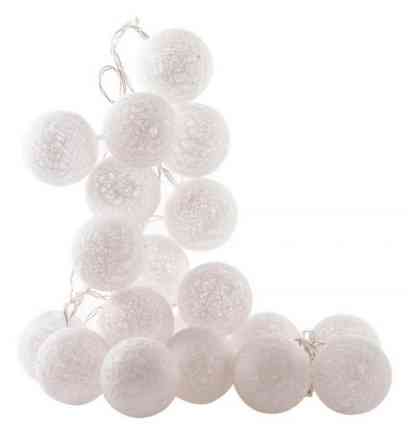 Guirnalda de 20 bolas textiles tipo ovillo de hilo blanco. Iluminadas con bombillas pitelo recambiables (incluye 3 recambios) de luz cálida y tenue.