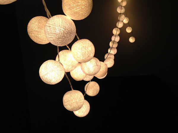 Guirnalda de 20 bolas textiles tipo ovillo de hilo blanco. Iluminadas con bombillas pitelo recambiables (incluye 3 recambios) de luz cálida y tenue.