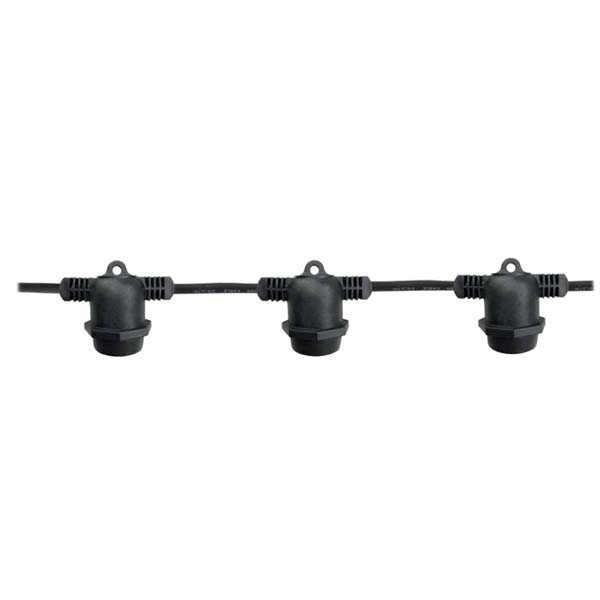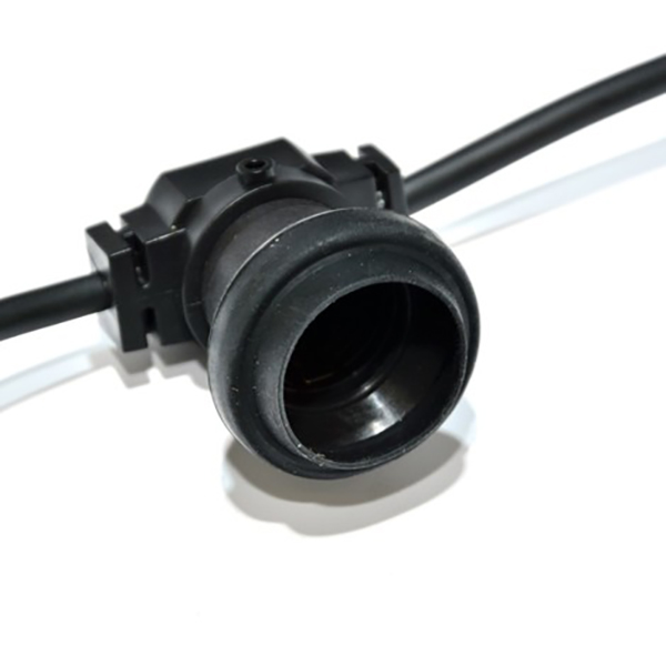 Guirnalda de 7m de cable, con 5 portalámparas E27 para 5 bombillas. En un extremo acaba en una clavija de enchufe, lista para usar y en el otro, un tapón finalizador que permite desenroscarlo y enlazar otra guirnalda.