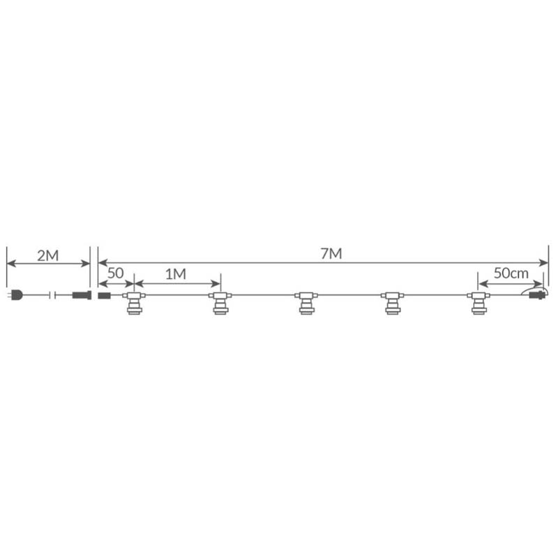Guirnalda de 7m de cable, con 5 portalámparas E27 para 5 bombillas. En un extremo acaba en una clavija de enchufe, lista para usar y en el otro, un tapón finalizador que permite desenroscarlo y enlazar otra guirnalda.
