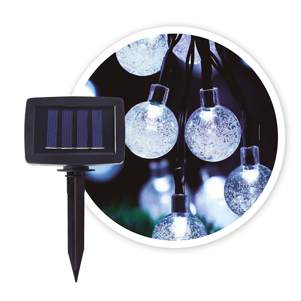Guirnalda decorativa de 5m de longitud con 20 bolas de luz blanca. Alimentada con placa solar.