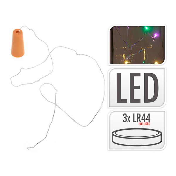 Adorno guirnalda LED con formato de tapón botella. Alambre plateado de 75cm con 8 LEDs multicolor. En la base lleva las pilas y un pequeño interruptor. Ideal para decorar botellas.