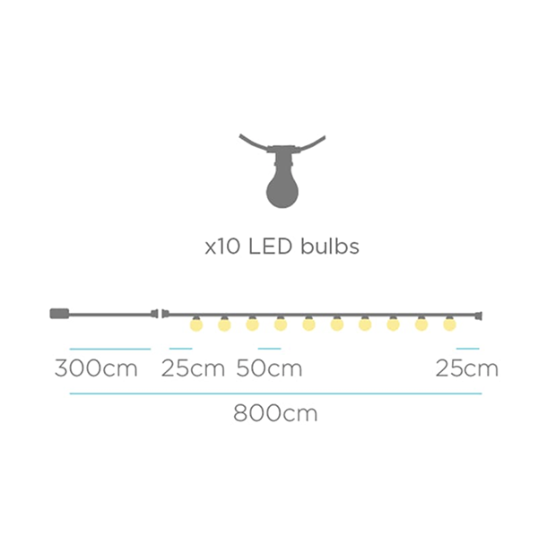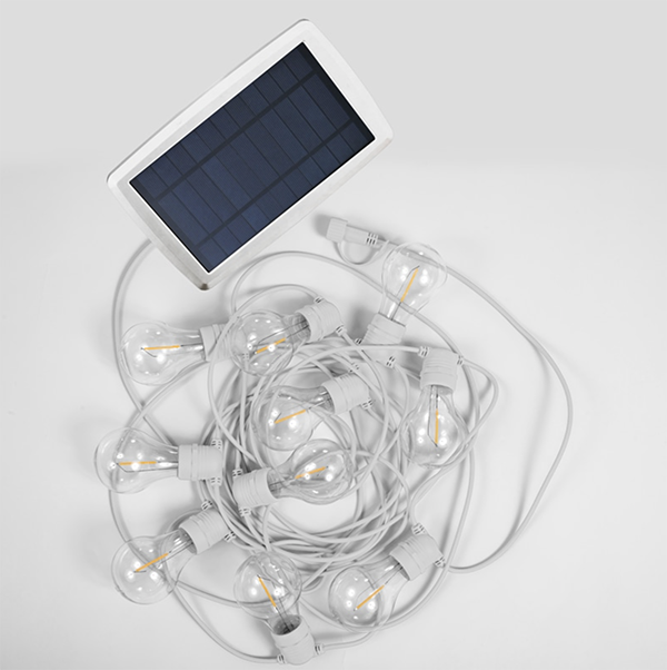 Guirnalda de 8m y 10 bombillas de aspecto vintage, con placa solar. Cable y casquillos de color blanco.