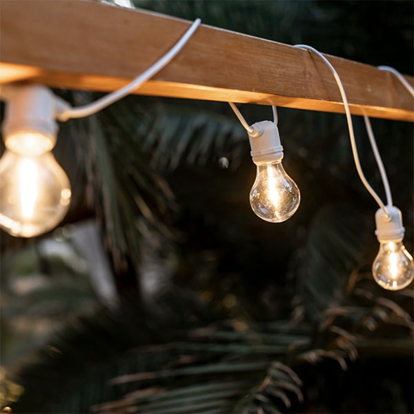 Sus luces son bombillas LED transparentes, de muy bajo consumo, que emiten una luz de color cálida.