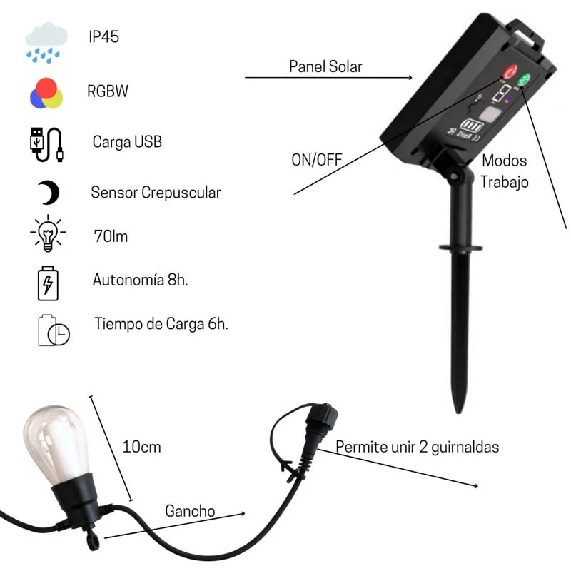 Guirnalda decorativa formada por una cadena de 5m (+3m extensión) con 10 luces LED, simulando bombillas pebeteros transparentes. Sus luces son un LED RGB de muy bajo consumo accionadas por mando a distancia. Se pueden iluminar en colores fijos, en luz blanca o en varios efectos de luces. Iluminación de decoración, para crear una atmósfera mágica. Carga solar, alimentada por una placa solar, orientable 180º para controlar mejor la carga. Con un estoque para clavar al suelo.