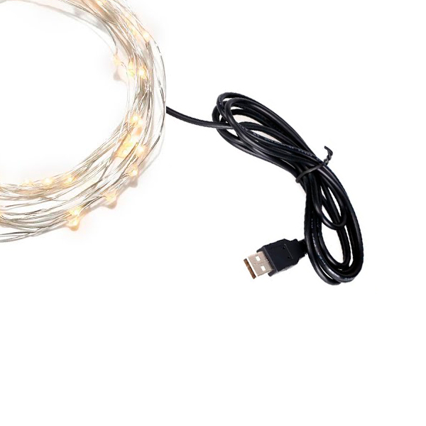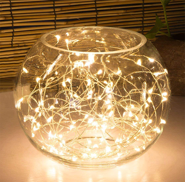 Guirnalda de finísimos LED’s (conocidos como “granos de arroz”) de tono cálido, montados a lo largo de una tira de alambre plateado de 10m.  Elegante adorno para navidad y también para el resto del año. Quedan muy bonitas dentro de recipientes de cristal. Se pueden moldear, enroscar o colocar en los objetos que quieras.