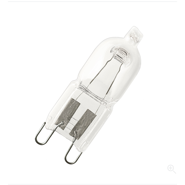 Bombilla eco-halógena de 33W, equivalente a una halógena de 40W, con el mismo tipo de luz (halógena cálida). Cristal transparente. Casquillo Halopin (G-9). Funciona directamente a 220V (sin transformador)