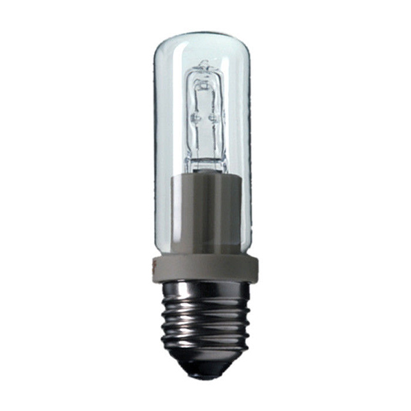 Bombilla halógena tubular con encapsulado cilíndrico de cristal transparente. “Energy Saber”, ahorra un 30%. Consume 105W y equivale a 150W de la halógena tradicional.  Funciona directamente a 220V. Para casquillos de rosca estándar E-27.