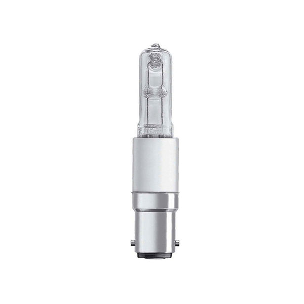 Bombilla halógena tubular con encapsulado cilíndrico de cristal transparente. Conocidas como MINICAN. “Energy Saber”, ahorra un 30%. Consume 70W y equivale a 100W de la halógena tradicional.  Funciona directamente a 220V. Para casquillos tipo bayoneta (Ba15D)