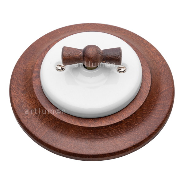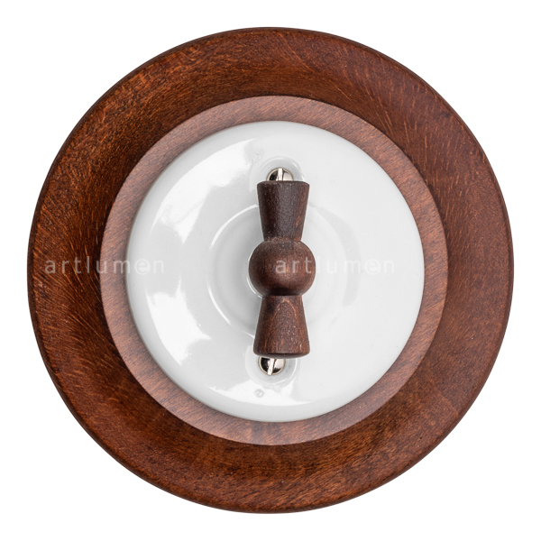 Interruptor conmutado fabricado en porcelana blanca con lazo (maneta) de madera natural de haya con barniz color castaño oscuro. Marco de madera oscura para instalación empotrada.