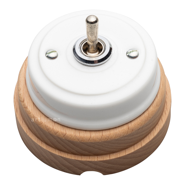 Interruptor con mecanismo conmutado de palanca, conocidos popularmente como “de rabillo”. El mecanismo queda elegantemente integrado en la porcelana, rematado con una arandela embellecedora metálica. Montado sobre una base de madera de haya barnizada en acabado natural. Combina a la perfección con nuestros enchufes de porcelana de esta misma serie.