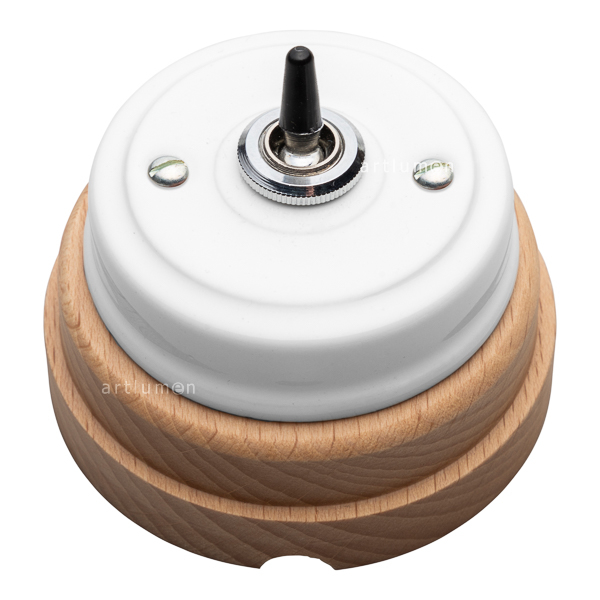 Interruptor con mecanismo conmutado de palanca, conocidos popularmente como “de rabillo”. El mecanismo queda elegantemente integrado en la porcelana, rematado con una arandela embellecedora metálica. Montado sobre una base de madera de haya barnizada en acabado natural. Combina a la perfección con nuestros enchufes de porcelana de esta misma serie.