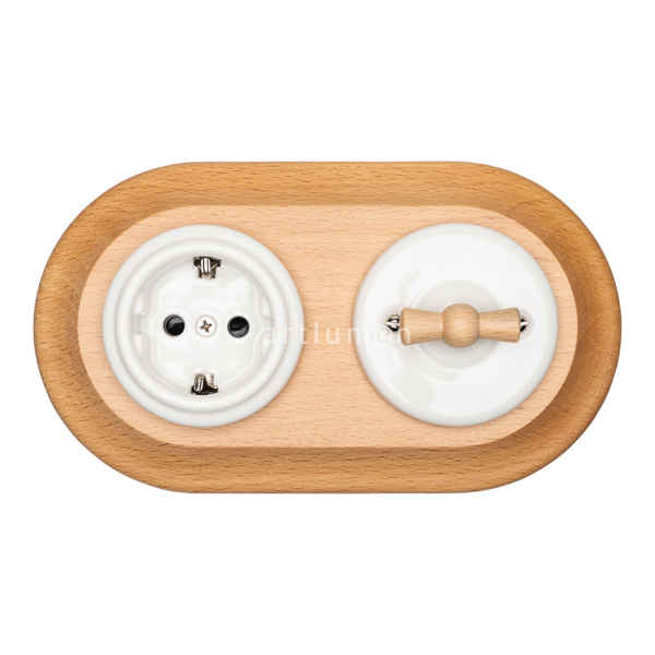 Conjunto formado por interruptor conmutado y base de enchufe fabricados en porcelana blanca y marco doble de madera clara.
