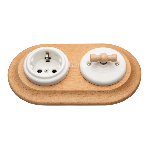 Conjunto formado por interruptor conmutado y base de enchufe fabricados en porcelana blanca y marco doble de madera clara.