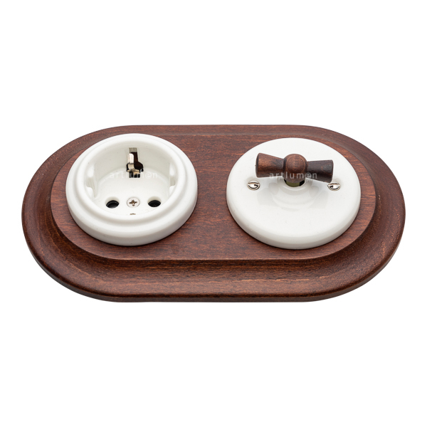 Conjunto formado por interruptor conmutado y base de enchufe fabricados en porcelana blanca y marco doble de madera oscura. El interruptor tiene el lazo (maneta) de madera natural de haya con barniz color castaño oscuro. Para instalación empotrada. Mecanismos clásicos de porcelana sobre madera de haya con barniz color castaño oscuro. Cuidados diseños que nos trasladan a ambientes rústicos. De formas planas y suaves para que los mecanismos de porcelana no sobresalgan en exceso de la pared.